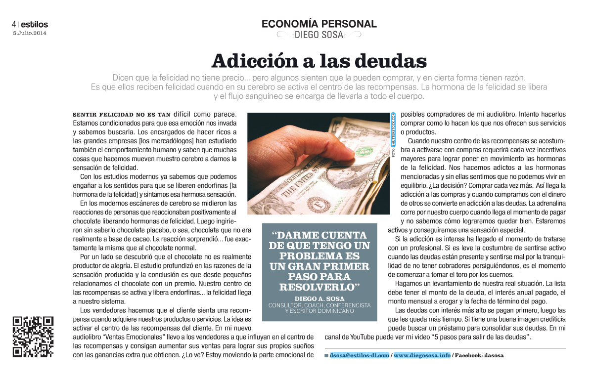 Si la adicción es intensa ha llegado el momento de tratarse con un profesional. Si es leve la costumbre de sentirse activo cuando las deudas están presente y sentirse mal por la tranquilidad de no tener cobradores persiguiéndonos, es el momento de comenzar a tomar el toro por los cuernos.