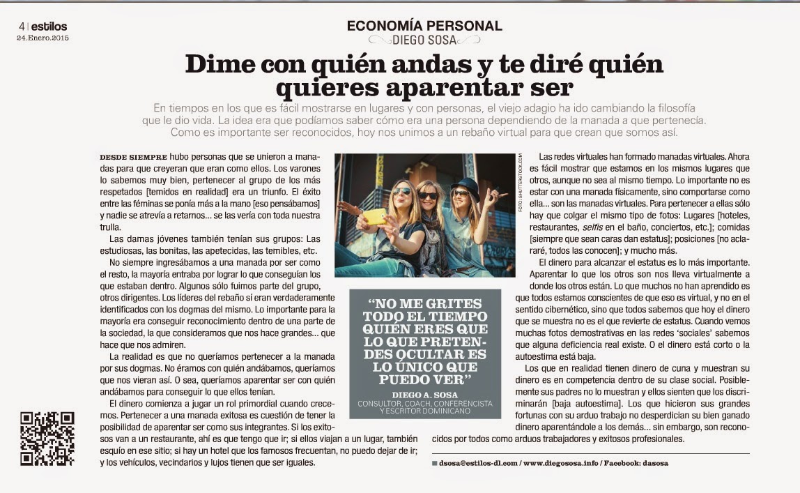 En tiempos en los que es fácil mostrarse en lugares y con personas, el viejo adagio ha ido cambiando la filosofía que le dio vida. La idea era que podíamos saber cómo era una persona dependiendo de la manada a que se pertenecía. Como es importante ser reconocidos,hoy nos unimos a un rebaño virtual para que crean que somos así.