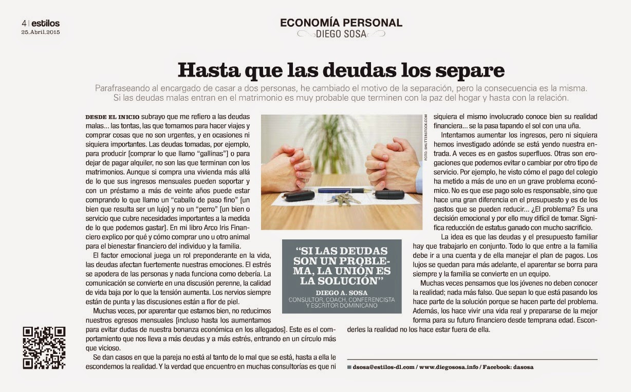 Desde el inicio subrayo que me refiero a las deudas malas… las tontas, las que tomamos para hacer viajes y comprar cosas que no son urgentes, y en ocasiones ni siquiera importantes. Las deudas tomadas, por ejemplo, para producir (comprar lo que llamo “gallinas”) o para dejar de pagar alquiler, no son las que terminan con los matrimonios. Aunque si compra una vivienda más allá de lo que sus ingresos mensuales pueden soportar y con un préstamo a más de veinte años puede estar comprando lo que llamo un “caballo de paso fino” (un bien que resulta ser un lujo) y no un “perro” (un bien o servicio que cubre necesidades importantes a la medida de lo que podemos gastar). En mi libro Arco Iris Financieroexplico por qué y cómo comprar uno u otro animal para el bienestar financiero del individuo y la familia.