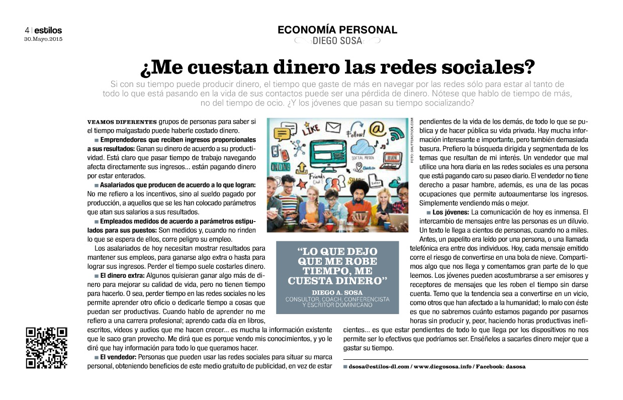 Los jóvenes: La comunicación de hoy es inmensa. El intercambio de mensajes entre las personas es un diluvio. Un texto le llega a cientos de personas, cuando no a miles. Antes, un papelito era leído por una persona, o una llamada telefónica era entre dos individuos. Hoy, cada mensaje emitido corre el riesgo de convertirse en una bola de nieve. Compartimos algo que nos llega y comentamos gran parte de lo que leemos. Los jóvenes pueden acostumbrarse a ser emisores y receptores de mensajes que les roben el tiempo sin darse cuenta. Temo que la tendencia sea a convertirse en un vicio, como otros que han afectado a la humanidad; lo malo con éste es que no sabremos cuánto estamos pagando por pasarnos horas sin producir y, peor, haciendo horas productivas ineficientes… es que estar pendientes de todo lo que llega por los dispositivos no nos permite ser lo efectivos que podríamos ser. Enséñelos a sacarles dinero mejor que a gastar su tiempo.