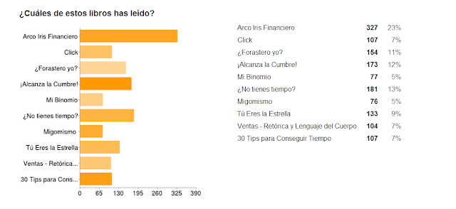La segunda pregunta fue sobre cuáles libros míos habían leído los encuestados. El ganador unánime entre los votantes es Arco Iris Financiero, y las ventas en todo el mundo apoyan los resultados. Me sorprendió ver otros libros peleando buenas posiciones, se nota que muchos de mis lectores aprecian libros que no se han vendido tanto como otros, pero que son más leídos, como ¡Alcanza la Cumbre! y ¿Forastero Yo? Dos libros que debería promocionar más para que otras personas puedan sacarle la utilidad que muchos de mis lectores le sacan.