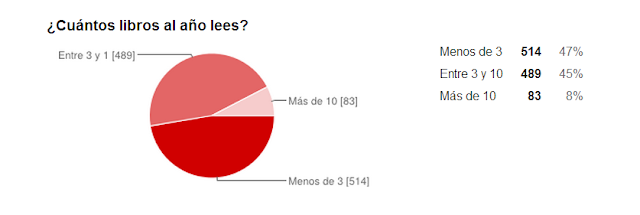 La tercera pregunta se refería a la cantidad de libros que leen los votantes al año. Casi la mitad lee menos de 3 libros. Otro 45% lee entre 3 y 10 libros. Y un ocho por ciento lee más de 10 libros al año.