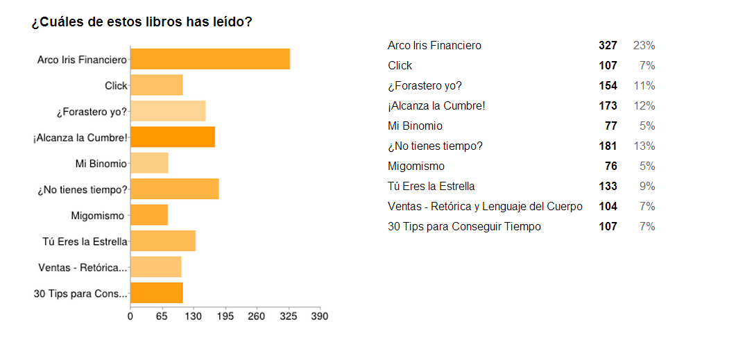 La segunda pregunta fue sobre cuáles libros míos habían leído los encuestados. El ganador unánime entre los votantes es Arco Iris Financiero, y las ventas en todo el mundo apoyan los resultados. Me sorprendió ver otros libros peleando buenas posiciones, se nota que muchos de mis lectores aprecian libros que no se han vendido tanto como otros, pero que son más leídos, como ¡Alcanza la Cumbre! y ¿Forastero Yo? Dos libros que debería promocionar más para que otras personas puedan sacarle la utilidad que muchos de mis lectores le sacan.