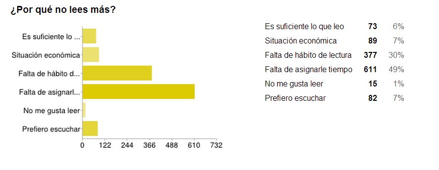 La cuarta pregunta me servía para encontrar formas de ayudar a las personas a conseguir más conocimientos a partir de la lectura. El 49% dice que no lee por falta de hábito de lectura y otro 30% por falta de asignarle tiempo a la lectura. Eso es la gran mayoría y en esos debo centrarme. Para los que no le dedican el tiempo que quisieran les sugiero trabajar el manejo del tiempo. Siempre tendremos las mismas 24 horas y cada día más cosas que hacer. Lo importante es hacer las tareas de una manera diferente, logrando más en menos tiempo. Mi método detallado en mi libro ¿No tienes tiempo? le puede ser de gran utilidad.