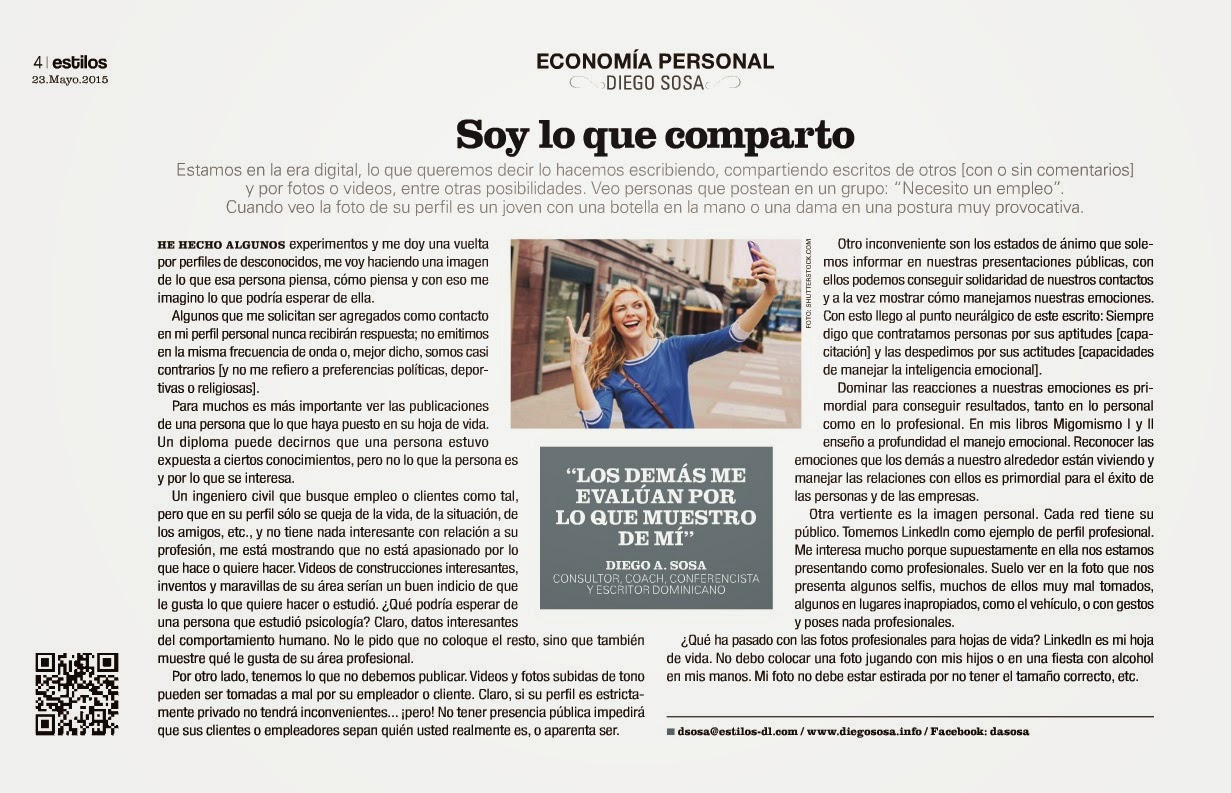 Estamos en la era digital, lo que queremos decir lo hacemos escribiendo, compartiendo escritos de otros (con o sin comentarios) y por fotos o videos, entre otras posibilidades. Veo personas que postean en un grupo: “Necesito un empleo”. Cuando veo la foto de su perfil es un joven con una botella en la mano o una dama en una postura muy provocativa.